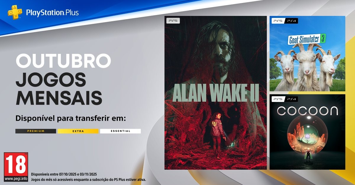 Chegou a hora de atualizar sua biblioteca, gamer! 🎮 A PlayStation Plus revelou os jogos mensais de outubro de 2025, e a seleção tá de primeira. De terror psicológico a cabras malucas, tem opção para todos os gostos. Os games ficam disponíveis para download gratuito de 7 de outubro a 3 de novembro para quem é assinante do PS Plus Essential.