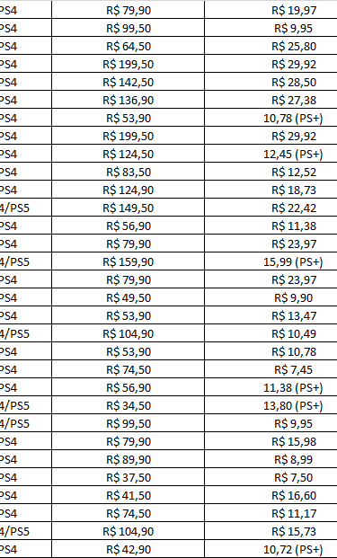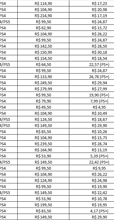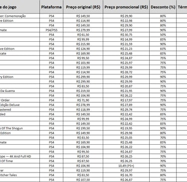E mais abaixo, você encontra uma lista completa com quase 100 jogos até 30 reais, todos separados por console, preço promocional e desconto. É só escolher seus favoritos e aproveitar!
